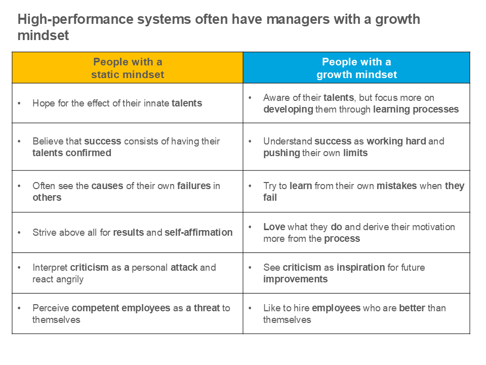 In her book Growth Mindset, Stanford professor Carol Dweck distinguishes between a static and a growth mindset.22 The following figure compares these two mindsets. High-performance systems often have leaders with a growth mindset. An important characteristic is that these people are aware of their talents, but place greater emphasis on their further development and learning processes. In contrast, people with a static worldview place greater hope in the effect of their innate talents.