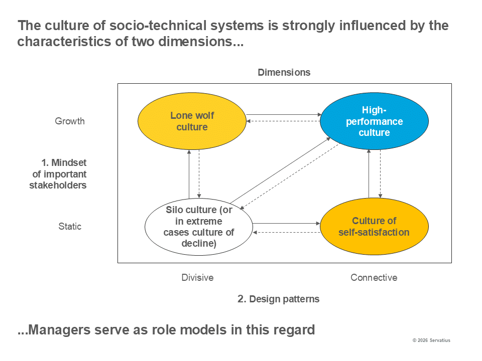 High-performance cultures are characterized by a growth mindset and a connective pattern. The opposite is a silo culture or, in extreme cases, a culture of self-satisfaction. Here, a static mindset and a divisive design dominate. Descriptions of outstanding leaders often heroize a lone wolf culture. These individuals are attributed with a growth mindset. At the same time, however, the impression is created that their successes were achieved single-handedly and in isolation from others, which is usually not the case. Until a few years ago, a culture of complacency was widespread in Germany. People rested on the successes of the past, but the mindset in politics and business was rather static and not very future-oriented.