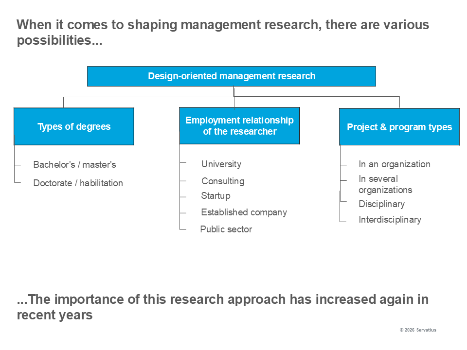 The following figure summarizes various possible forms of design-oriented management research. Here, we distinguish between the type of degrees, the employment relationship of the researcher and the project and program types. In a part-time doctorate of a consulting employee, for example, it makes sense to compare the results of projects from several organizations and derive new insights from them. What seems important in this research approach is that design-oriented research projects based on theoretical foundations35 now focus more strongly on concrete application in practice.