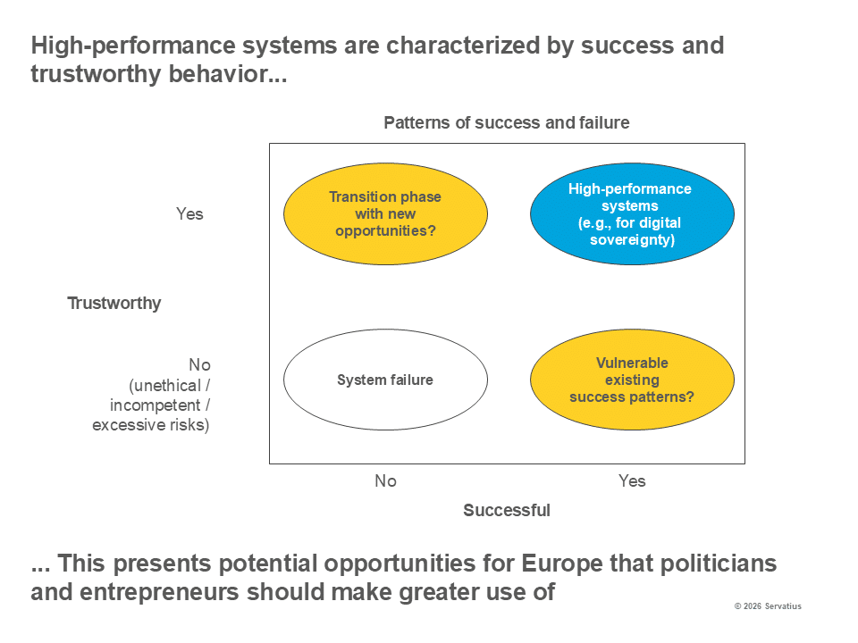 Reinterpreting high performance means that high-performance systems are characterized by both success and trustworthy behavior. If neither of these is the case, we speak of system failure. Most socio-technical systems fall somewhere in between. Cases where only one of the two criteria is met are interesting. An existing pattern of success is at risk when a previously successful system, such as that of the AI champions, loses trust. This could result in a transitional phase with new opportunities, for example, if Europe, which has been less successful in digitalization to date, scores points with trust.